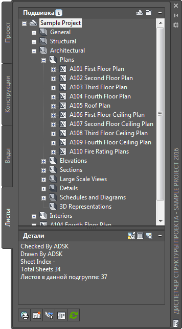 Списки подшивок, листов, видов листов, чертежей с листами и видов пространства модели приведены на вкладках "Листы" и "Виды" Диспетчера структуры проекта.