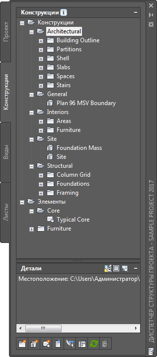 Для облегчения организации структуры здания компоненты проекта здания, такие как конструкции, виды и листы, можно разбить на категории. Можно использовать такие категории, как оболочка, каркас и внутренние перегородки. Отнесение конструкции к некоторой категории позволяет выполнять фильтрацию при формировании видов.