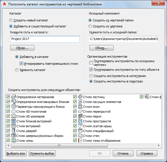 | сгруппировать полученные инструменты по типу объектов | выберите "Группировать инструменты по типу объекта". Данная функция особенно удобна, если надо объединить стили из различных чертежей в новый каталог стилей. Созданные инструменты размещаются в категориях или палитрах с именами "Стены", "Двери" и т. д. Прим.: Если помечены оба флажка, то группировка инструментов в каталоге производится сначала по чертежам, а затем по типам объектов, при этом категории создаются из чертежей, а палитры - из типов объектов. Такой вариант используется, поскольку палитры не могут быть вложенными. В данном случае переключатели для категорий и палитр отключены, включен переключатель "Создать инструменты по палитрам".