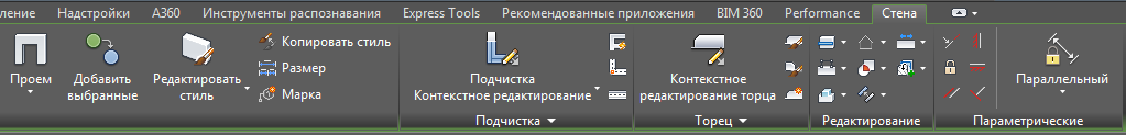 • На контекстной вкладке для объекта на ленте выберите команду "Редактировать по месту". В зависимости от объекта команда редактирования по месту может находиться на разных панелях. Кроме того, у некоторых объектов, например стен или витражей, может быть несколько компонентов на основе профилей. В этом случае сначала выберите панель, соответствующую компоненту, а затем связанную с ней команду "Редактировать по месту".