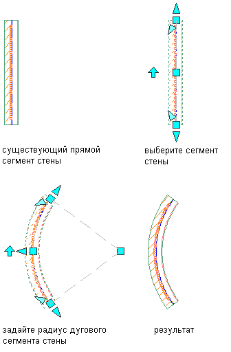Данная процедура используется для того, чтобы изменить форму стены с прямой на дуговую или с дуговой на прямую. При изменении прямой стены на дуговую программа добавляет ручку "Вторая точка кривой" в середине сегмента стены. Данная ручка впоследствии может использоваться для изменения формы дуги.