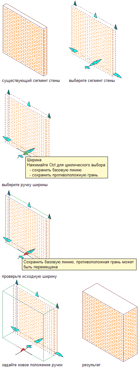 Для изменения толщины стены с сохранением противоположной грани стены с помощью ручек