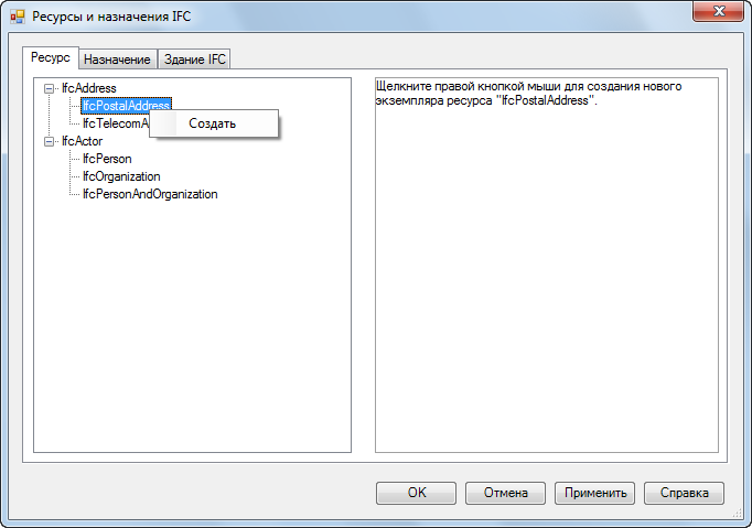 В левой панели диалогового окна щелкните правой кнопкой мыши на "Ресурс IFC" (например, IfcPostalAddress) и выберите "Новый".