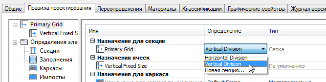 Данная процедура предназначена для того, чтобы назначить сетке блока витражей деление. Деление определяет ориентацию сетки (направление, в котором располагаются ячейки сетки и импосты, - горизонтальное или вертикальное) и тип деления (количество и размер ячеек).
