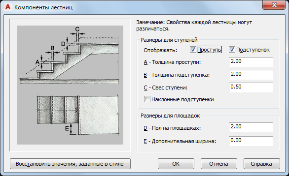 Прим.: Если параметры компонентов недоступны, это значит, что управление ими осуществляется через стиль лестницы, и пользователь не имеет возможности изменять их в отдельных лестницах.