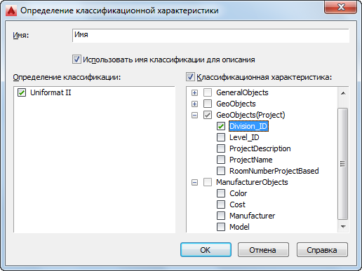 Отображается диалоговое окно "Определение классификационной характеристики". На панели слева перечислены определения классификации, которые относятся к стилю объекта для текущего определения набора характеристик. Например, если текущее определение набора характеристик применяется к стилям дверей, в панели "Классификация" перечислены все описания классификаций, применимых к стилям дверей.