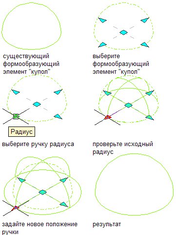 Эта процедура используется для изменения посредством ручек радиуса формообразующего элемента с кругом в основании. К формообразующим элементам с кругом в основании относятся конусы, цилиндры, купола, дорические колонны, шары и тела вращения.
