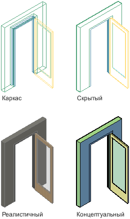 Двери в представлениях визуальных стилей "Каркас", "Скрытый", "Реалистичный" и "Концептуальный".