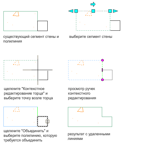 Данная процедура применяется для редактирования торца стены путем объединения профиля с компонентом. Профилем может являться любая площадь внутри замкнутой полилинии, перекрывающая конкретный компонент или совпадающая с ним.