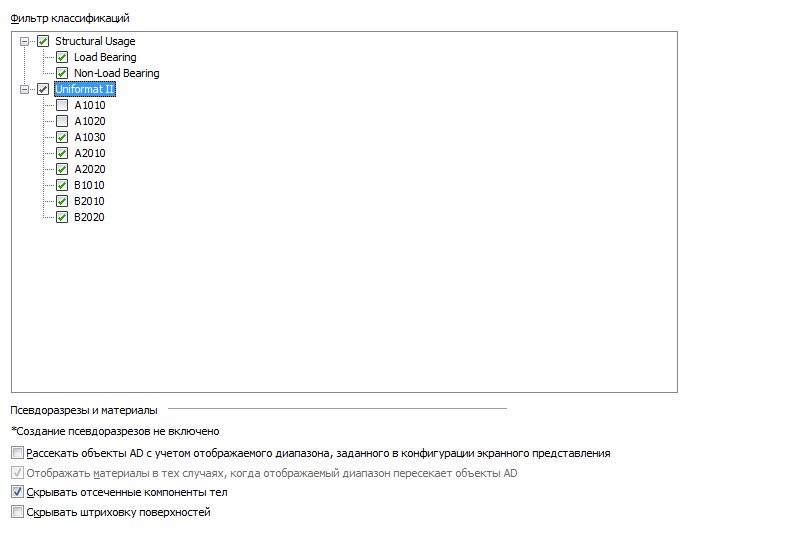 Например, для скрытия всех дверей и стен, имеющих классификации A1010 и A1020, следует убрать флажки "A1010" и "A1020" в пункте "Единый формат II".