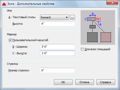 Данная процедура позволяет задать для зоны стиль текста, размер обозначения зоны и стрелку соединительной линии зоны. В дополнительных свойствах можно также указать, для каких пространств будет использоваться штриховка зоны (только для непосредственно прикрепленных пространств или также для пространств, прикрепленных через субзоны).