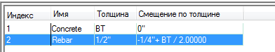 Для более сложных случаев расположения объектов относительно друг друга, в которых применяется переменная "Базовая толщина", можно составлять формулы для вычисления значений параметров "Толщина" и "Смещение по толщине". Например, если требуется расположить арматуру толщиной 0,5 дюймов в середине слоя бетона с фиксированной толщиной 6 дюймов, можно настроить компоненты в стиле перекрытий следующим образом: