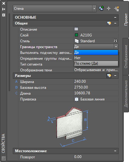 - "По стилю" ("Да" или "Нет"): данный объект использует значение параметра "Границы пространств", заданное в стиле объекта. Это значение используется по умолчанию для объектов, зависящих от стилей.