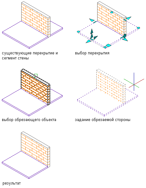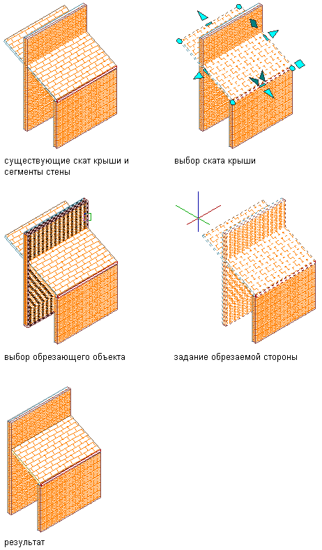 Эта процедура используется для обрезки перекрытия или ската крыши с помощью полилинии, стены, ската крыши или перекрытия, задающего плоскость обрезки.