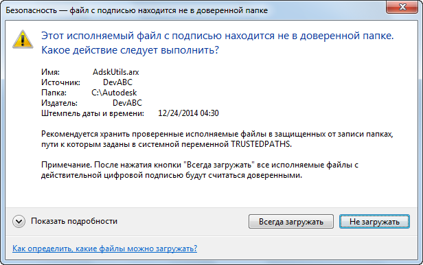 При загрузке файла пользовательской программы с цифровой подписью программа на основе AutoCAD проверяет цифровую подпись, добавленную к файлу. Отображается сообщение о проверке цифровой подписи, которое позволяет пользователю загружать или не загружать файл программы в среду чертежа.