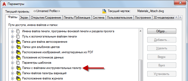 Файлы инструментальных палитр содержат стандартные и пользовательские инструменты. Файлы сохраняются в директориях, указанных в параметре "Местонахождение файлов инструментальных палитр".
