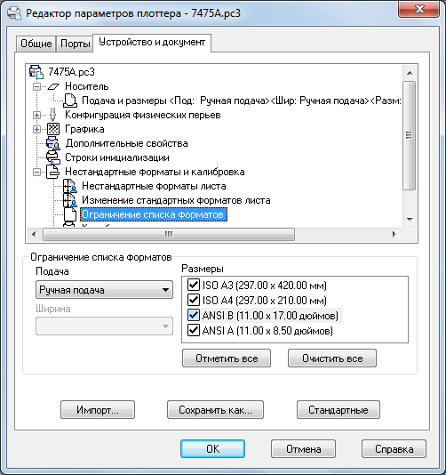 Настройка области печати для стандартных форматов листа с учетом возможностей принтера. (Нельзя создавать пользовательские форматы для системных принтеров Windows с помощью Редактора параметров плоттера.)