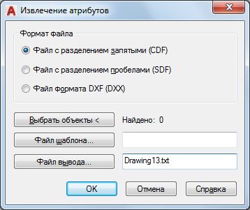 Указывает имя и положение файла, в который будут записаны извлеченные данные атрибутов. Введите путь и имя файла для извлеченных данных атрибута либо выберите "Файл вывода", чтобы выполнить поиск уже существующих файлов шаблонов в стандартном окне выбора файлов. Расширение имени файла .txt добавляется к файлам CDF или SDF, а расширение .dxx добавляется к файлам DXF.