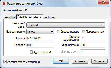 Текстовый стиль для текста атрибута. Параметры выбранного на данной вкладке стиля определяют свойства текста атрибута.