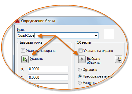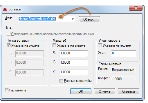 После вставки определение блока сохраняется в текущем чертеже. Теперь можно выбрать блоки непосредственно в раскрывающемся списке "Имя", не нажимая кнопку "Обзор".