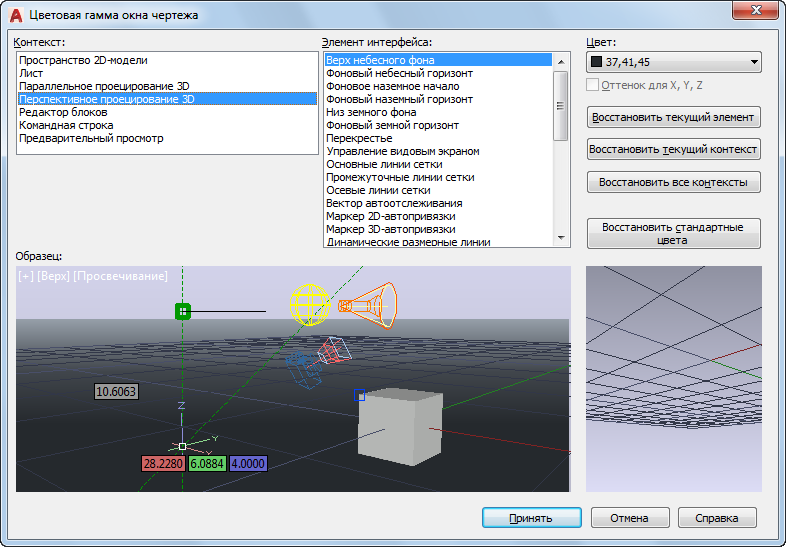 Диалоговое окно "Цветовая гамма окна чертежа"