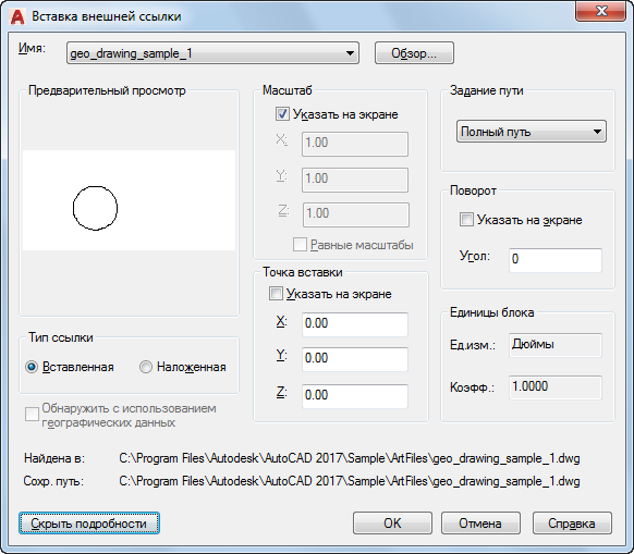 Выберите полный (абсолютный) путь, относительный путь к файлу внешней ссылки или "Путь не задан", имя файла внешней ссылки (файл должен быть помещен в ту же папку, в которой находится файл текущего чертежа).