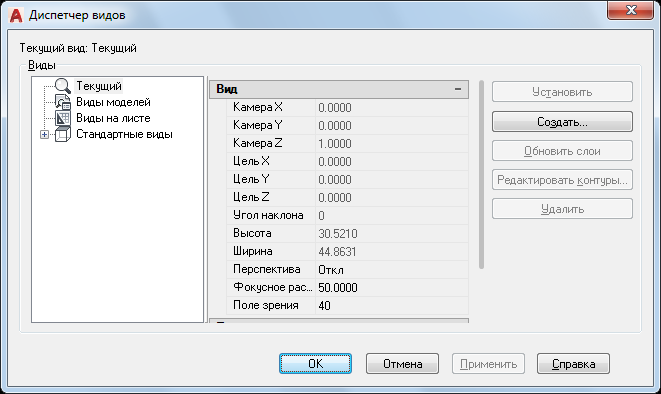Для всех видов, кроме вида на листе, указывается поле зрения по горизонтали (в единицах текущего угла). При изменении данного значения соответствующим образом изменяется фокусное расстояние.