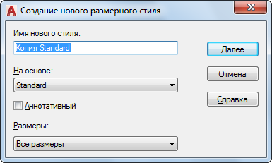Здесь указывается имя нового размерного стиля, базовый стиль для его создания и типы размеров, к которым он должен применяться.