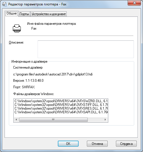 - тип драйвера (системный или несистемный), модель плоттера, путь к файлу драйвера