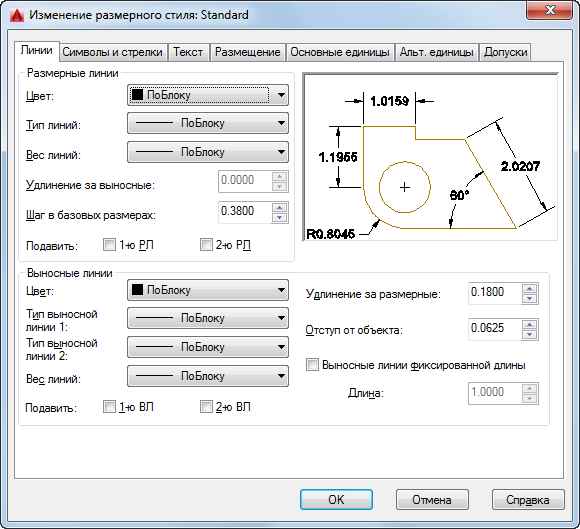 С помощью размерных стилей можно задать и обеспечить соблюдение стандартов черчения. Доступно множество размерных переменных, которые можно задать с помощью команды РЗМСТИЛЬ, позволяющей управлять практически всеми нюансами отображения и поведения размеров. Все эти параметры хранятся в каждом из размерных стилей.