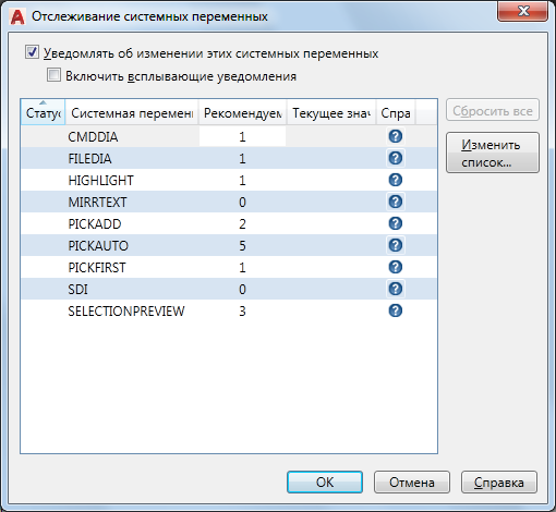 Отслеживание системных переменных и уведомление об изменении их предпочтительных значений. В большинстве случаев это происходит, когда пользовательская процедура отменена. Можно сбросить системные переменные, для которых восстановлено предпочтительное значение.