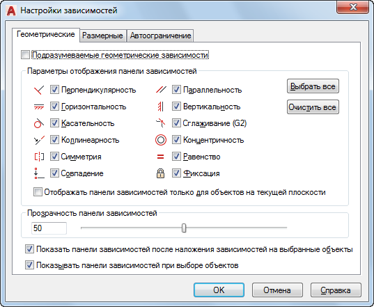 Параметры для разных типов зависимостей расположены на разных вкладках.