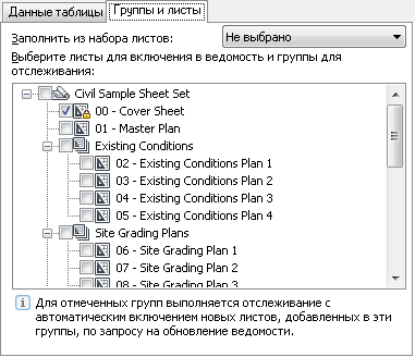 Вкладка "Группы и листы" (диалоговое окно "Ведомость листов")