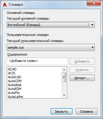Отображается имя текущего пользовательского словаря. Расширение имени файла .Для пользовательских словарей AutoCAD используется расширение файла cus.