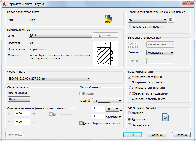 Параметры, относящиеся к весам линий, прозрачности, стилям печати, тонированным видовым экранам и к порядку вывода объектов на печать.