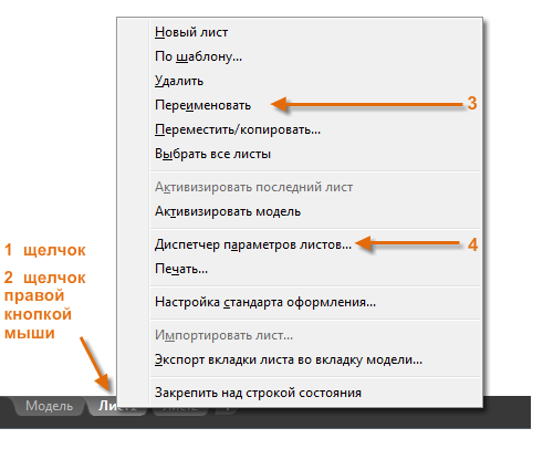 При открытии вкладки листа (1) в первую очередь нужно щелкнуть по ней правой кнопкой мыши (2) и изменить ее имя (3) на что-то более конкретное, чем "Лист 1". Для листов формата D подойдут названия вроде ARCH D или ANSI D.