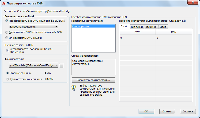 Позволяет выбрать и настроить параметры соответствия, используемые для текущего экспорта в DGN.