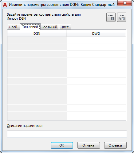 Импорт параметров соответствия: Если диалоговое окно "Изменить параметры соответствия DGN" вызвано при создании нового набора параметров соответствия в диалоговом окне "Параметры импорта DGN", в столбце "DGN" содержатся все типы линий, определенные в импортируемом файле DGN, а также определенные в файле-прототипе DGN на момент создания файла DGN.