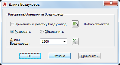 | Создать разрыв на сегменте | Выберите "Разорвать" и введите значение в поле "Длина воздуховода". Кроме того, можно нажать |
