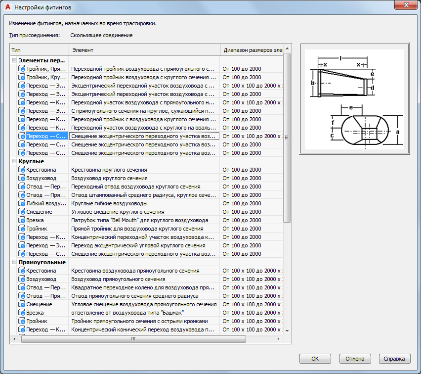 В таблице "Параметры фитингов" отображается текущий тип соединения, а также список доступных типов и элементов.