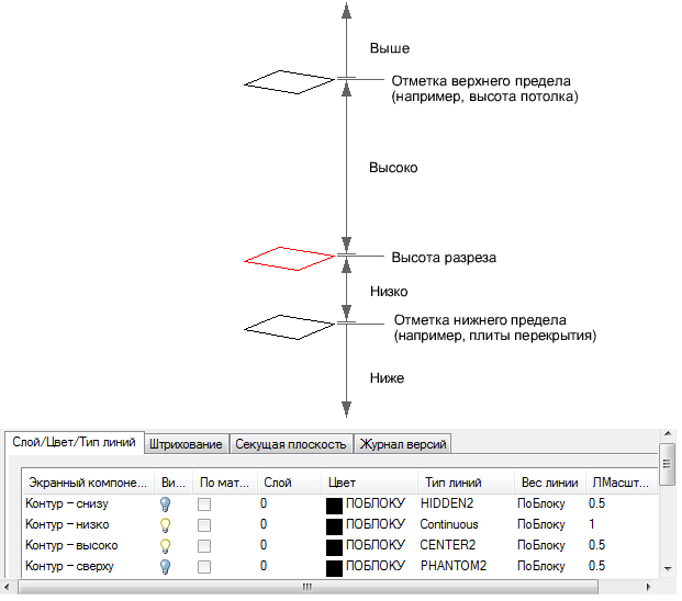Секущая плоскость — это высота, на которой производится разрезание объекта для получения представления вида в плане.