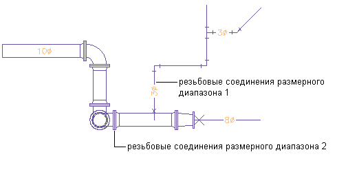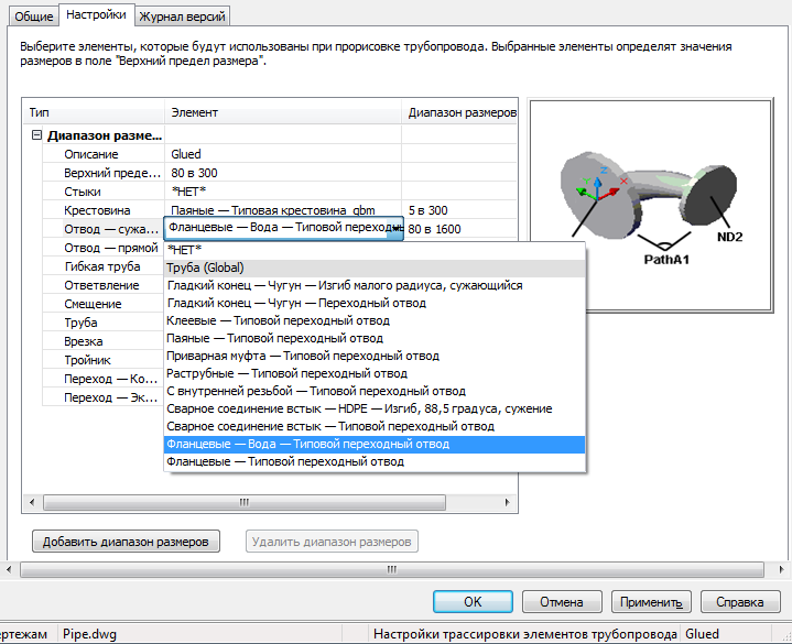 Трубы и фитинги, входящие в один диапазон размеров, должны иметь общие номинальные диаметры (условные проходы) в настройках трассировки, используемых в участке. Для диапазонов размеров действуют следующие условия: