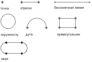Определяется отрезками, дугами и точками. Две дуги создаются касательными к двум отрезкам, для которых заданы начальные и конечные точки.