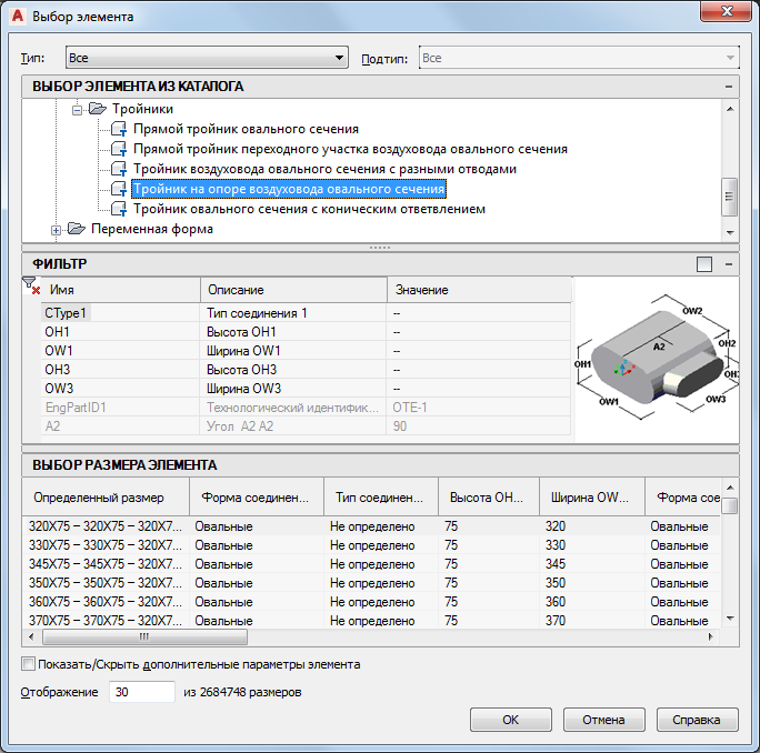 В разделе "Выбор элемента из каталога" диалогового окна фитинги воздуховодов упорядочены по типу формы.
