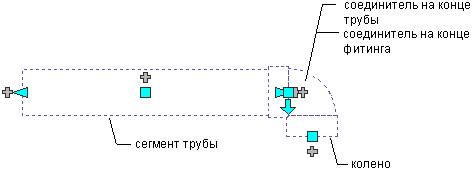 За исключением раструбных соединений, соединители труб расположены на концах сегментов труб и фитингов. На чертеже программа отображает трубу, соединенную с фитингом, как присоединенную к концу фитинга. Однако в реальном трубопроводе труба вставляется в фитинг.