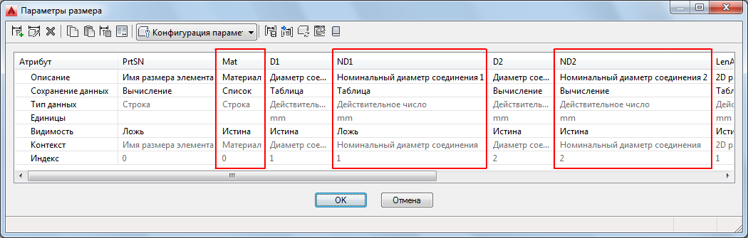 Диалоговое окно "Параметры размера" обновлено для отображения дополнительных отдельных размеров внешнего (номинального) диаметра (ND1, ND2) и материала (Mat), как показано далее. В предыдущих версиях в конструкторе содержимого был доступен только фактический диаметр (D1, D2).