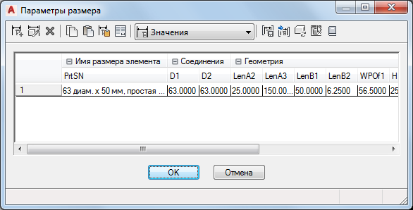 - Значения. Данный режим служит для просмотра и изменения значений параметров, если они хранятся как списки, таблицы и константы. Несколько размеров элементов задаются путем ввода нескольких значений для параметров размеров. Можно вводить значения вручную или копировать и вставлять их из другого элемента, открытого в Конструкторе содержимого, из элемента, открытого в Редакторе каталогов, или из электронной таблицы. Для параметров соединителей также можно вставить соответствующие размеры для сегментов, используемых по умолчанию во время компоновки.