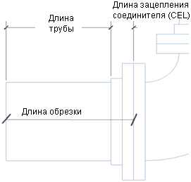 Длина обрезки соответствует расстоянию между соединителями внутри сегмента трубы. На следующей схеме показано отличие длины трубы от длины обрезки на основе значения CEL (длина соединения).