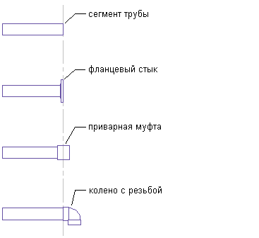 На третьем и четвертом рисунках показаны другие фитинги, присоединенные к концу трубы. При добавлении муфты средняя точка муфты расположена в месте окончания исходной трубы. Конец трубы смещается к смежному торцу муфты. Отвод добавляется к концу трубы, и в этом случае конец трубы остается на прежнем месте. Длина трубы остается прежней, однако длина обрезки увеличивается, поскольку к ней добавляется значение CEL для отвода. Во всех показанных выше соединениях полученные значения длины обрезки отличаются от исходной длины трубы.