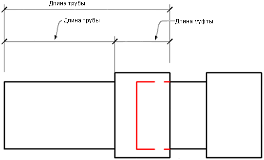Значение отчетной длины обрезки изменяется в зависимости от типа присоединения фитинга. Например, в случае фланцевых соединений с гладким концом программа учитывает общую длину соединяемого объекта, включая длину муфты. В следующем примере показано, как программа выводит отчет о длине обрезки на основе этого принципа. Общая рассчитанная длина включает сумму длины трубы и длины муфты, как показано на следующем рисунке.